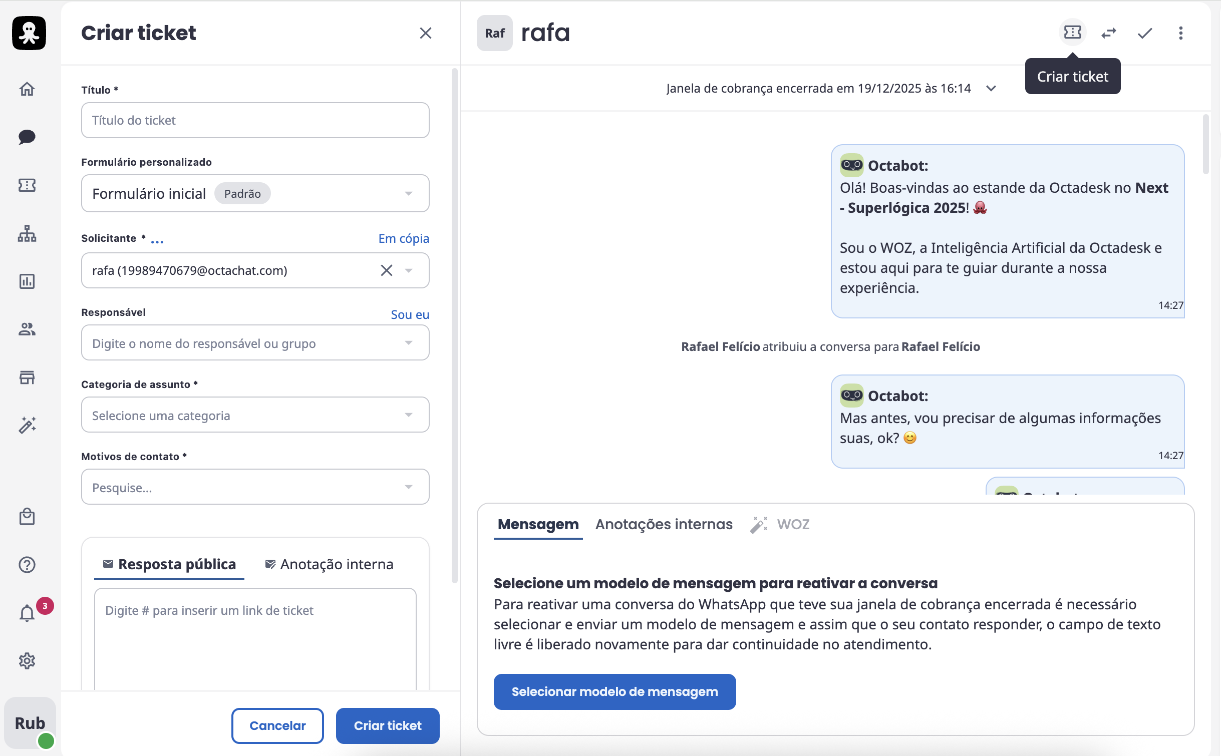 Aprimoramos a etapa de 'Envie uma mensagem de texto' no construtor de bots. A edição agora acontece dentro de um modal dedicado, que expande a área de visualização do texto, proporcionando uma escrita muito mais fluida e sem erros.