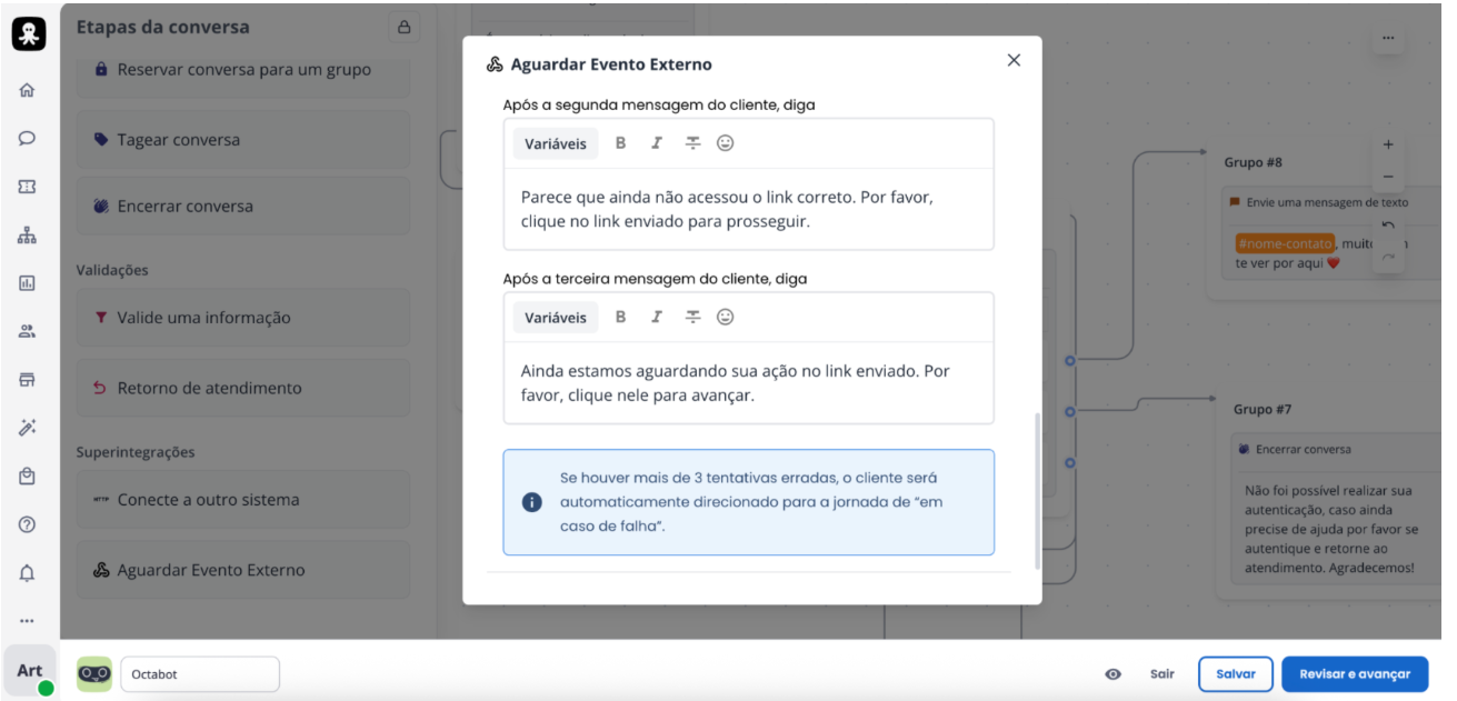 Com os eventos externos, é possível acionar fluxos automáticos com base em dados vindos de fora da plataforma, tudo isso dentro da conversa.